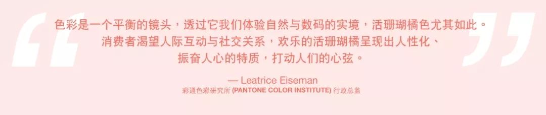 活珊瑚橘代表著現(xiàn)代生活的多方融合,是在周遭自然環(huán)境中出現(xiàn)的滋養(yǎng)顏色,同時(shí)也是社交媒體里生動(dòng)呈現(xiàn)的顏色。